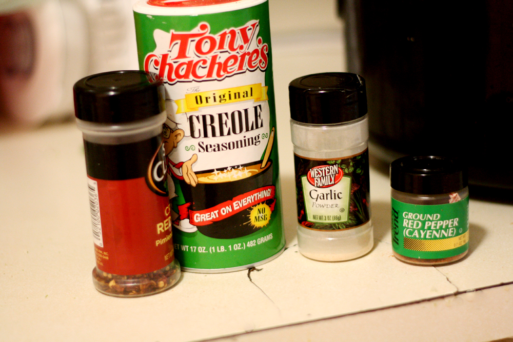 I use creole seasoning, garlic, cayenne pepper, red pepper flakes, and chili powder.